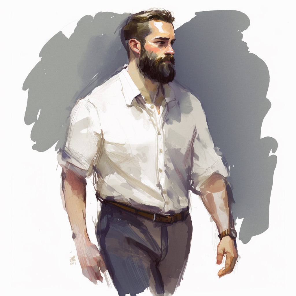 A man took notice of me. He was approximately six feet tall with dark hair, a manicured full beard, and wore a loose white shirt and dark blue snug-fitting pants. His open collar revealed a broad chest and large shoulders. I didn’t notice his shoes, but his gaze shifted from them back to me. He walked towards me with a smile and an open pose, lifting his arms, palms revealed. In a large, deep voice, he said, “What do you think?” making a gesture as if unveiling a grand opening.