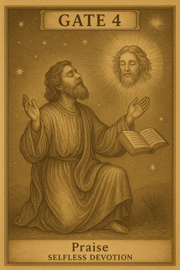 Gate Four, named Judah, is the portal of pure worship—the threshold at which the soul no longer seeks only identity (Reuben), intuitive hearing (Simeon), or union (Levi), but now stands in full adoration of the Light. This gate initiates the soul into divine rejoicing, into the state of perpetual gratitude and surrendered praise, regardless of circumstance.