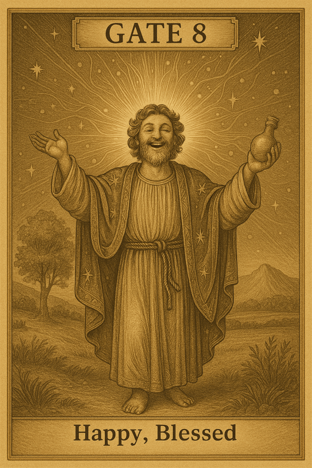 Gate 8 is the soul’s entrance into spiritual happiness—not as escape, but as the fruit of divine fullness. Here the soul ceases grasping and begins radiating. The path is no longer about survival or striving, but about offering joy as worship.
